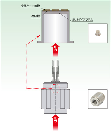 我們的薄膜型壓力傳感器是隔膜型,并使用金屬規(guī)格的薄膜。當(dāng)從壓力入口施加壓力時(shí),膜片變形,并且檢測(cè)到當(dāng)在膜片上形成的金屬規(guī)薄膜變形時(shí)發(fā)生的電阻變化。