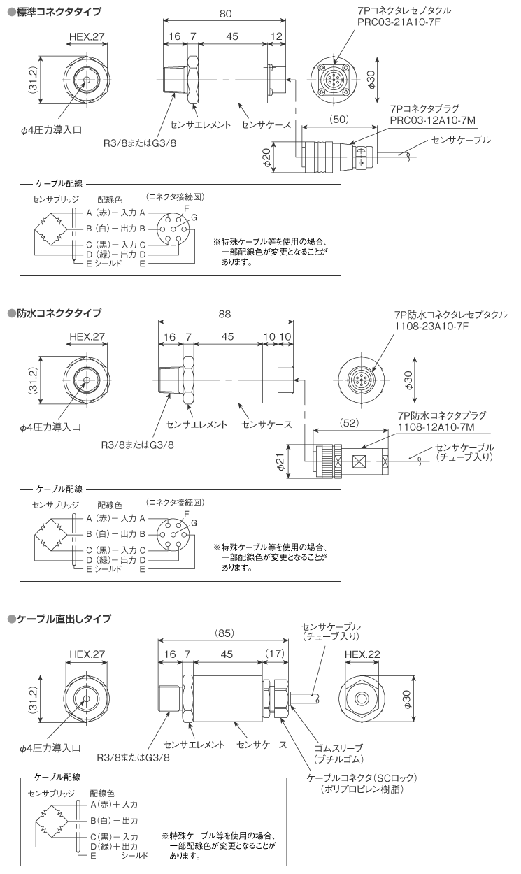 | ケーブル | 4芯シールド(耐油)ケーブル 3m標準 φ6mm 防水コネクタタイプ、ケーブル直出しタイプはφ6.5mmチューブ入りケーブル使用 |