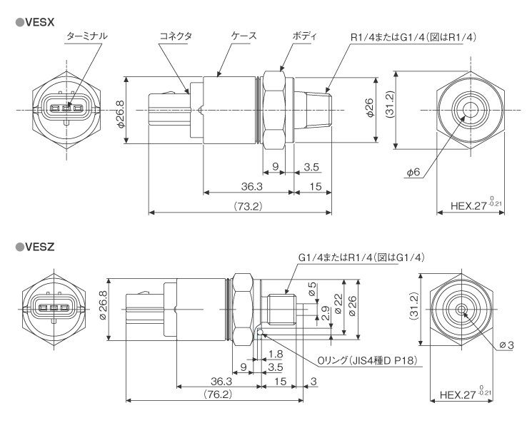 | 電源 | VESX : DC12VまたはDC24V(10~32V) [12mA以下](電圧出力タイプ) VESZ : DC12VまたはDC24V [10~26.5V](電流出力タイプ) |