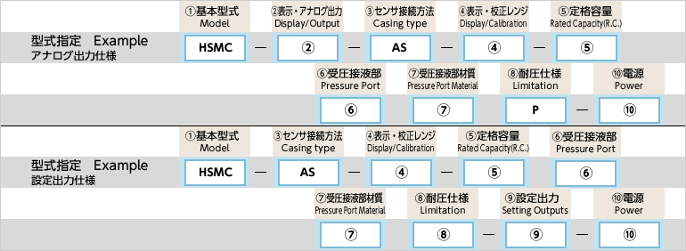 | 連成圧 | 定格容量 300kPa時 -100~300kPa (-100~300)kPa | 出力の校正レンジの、數値と単位を ( )で括ってご記入ください(※1)(※2) | |||