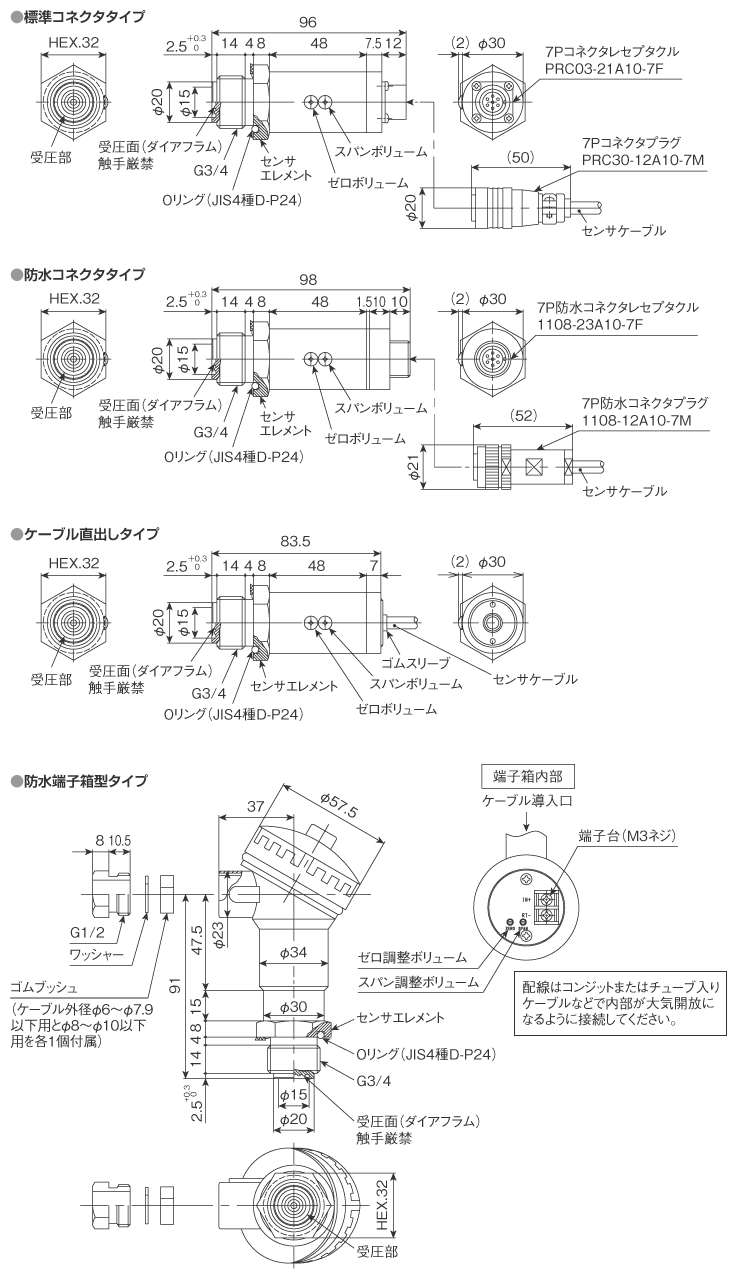 | ケーブル | 4芯または2芯シールド(耐油)ケーブル 2m標準 φ6mm 防水コネクタ?ケーブル直出しタイプの出力レンジ 500kPa以下はチューブ入りケーブル使用(ゲージ圧のみ) |