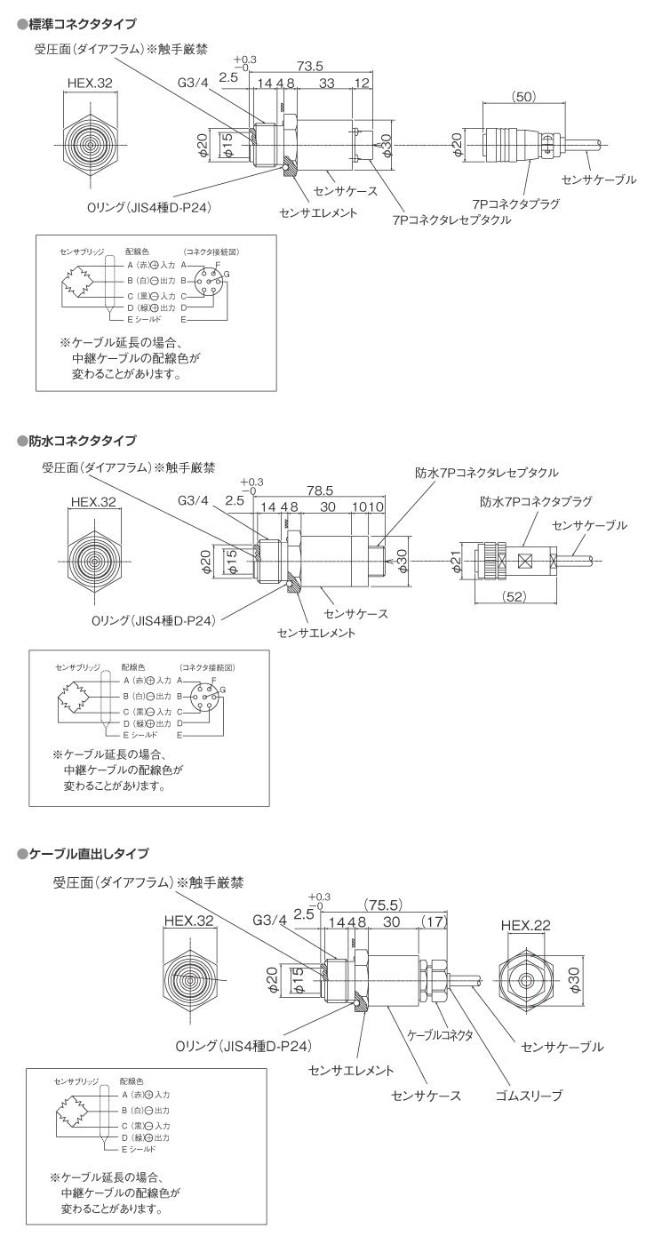 | ケーブル | 4芯シールド(耐油)ケーブル 3m標準 φ6mm ゲージ圧タイプの最大測定レンジ500kPa以下は、φ6.5mmチューブ入りケーブル使用 |