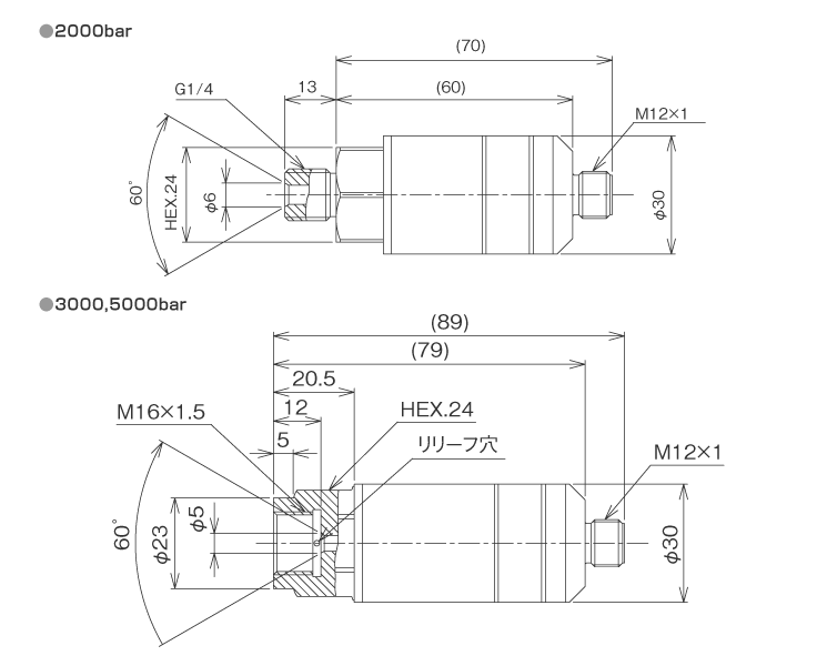 | 圧力導入部 | 2000bar:G1/4雄ネジ 3000,5000bar:M16×1.5雌ネジ | |