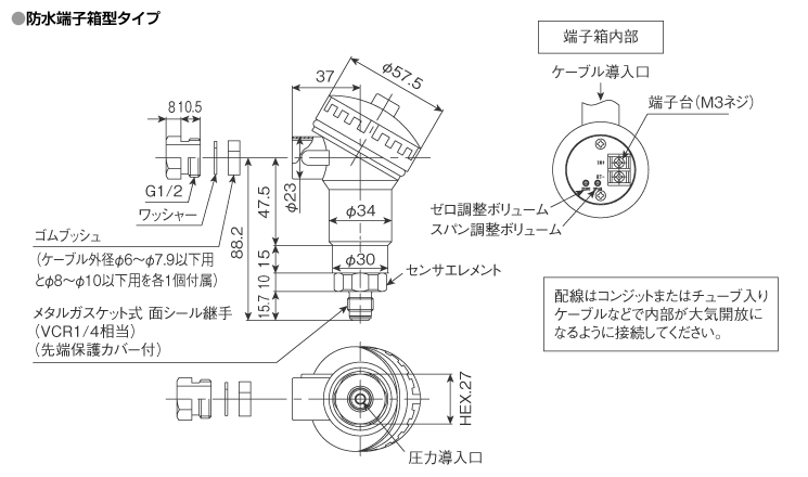 | ケーブル | 4芯または2芯シールド(耐油)ケーブル 2m標準 φ6mm 防水コネクタ?ケーブル直出しタイプのゲージ圧仕様はチューブ入りケーブル使用 |