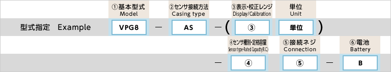 | 1.基本型式 | ○ | VPG8 | 電池式4桁LCD表示デジタル圧力計(jì) 文字高 12.7mm | ||