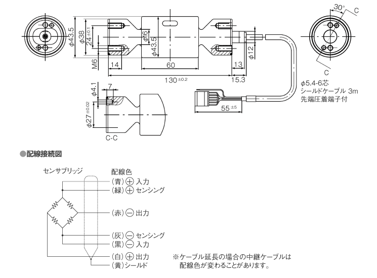 | ケーブル | φ5.4-6芯シールドケーブル 3m 先端圧著端子付 |