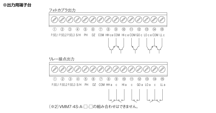 | 4S | 4點(HH/H/G/L/LL) | リレー信號×5 AC125V 0.3A(抵抗負荷) DC30V 1A(抵抗負荷) | ※アナログ出力、RS-232C出力、 RS-485出力付の選択は不可 | ||
