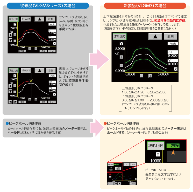 *不僅可以進行波形比較,還可以進行位移比較,因此即使停止也可以保持負荷值進行測量。
