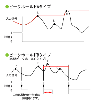 ピークホールドAタイプはフリーランタイプです。PH端子信號が開放または"1"レベルになるまでピーク値をホールドし続けます。右図の場合、2回目のピークのB點は無視され、A點以上の値が入力されるまでピークが表示され続けます。