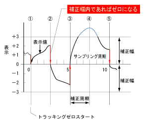 測定値を補正周期毎に確認し、補正幅內であればゼロに補正します。補正周期と補正幅は任意に設定可能です。(右図をご覧ください。)
