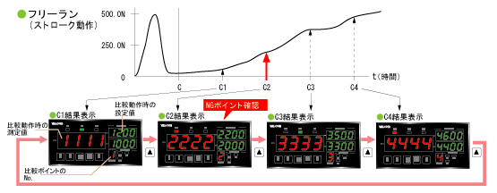 異常加圧によりNGと判定されたとき、直前の工程の比較C1~C4のどのポイントで異常加圧が発生したかを追いかける場合などに役立つ機能です。
